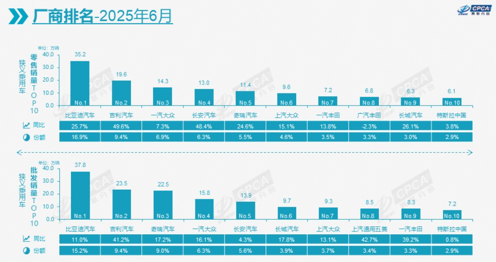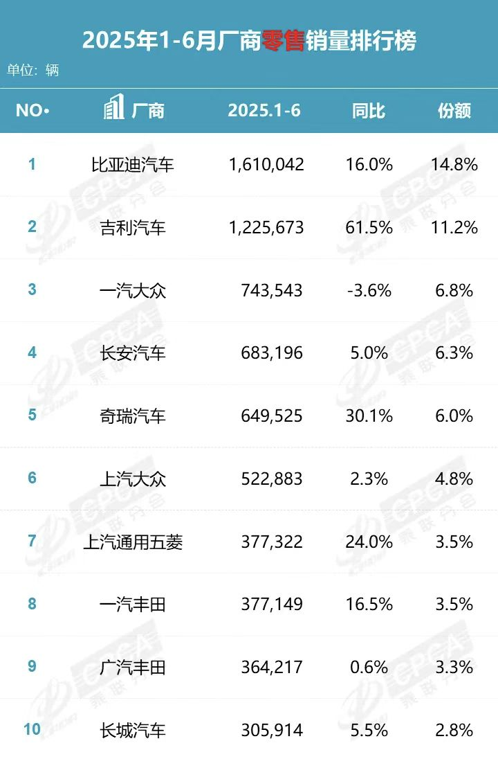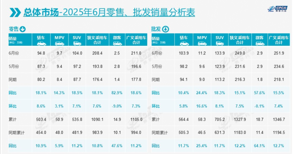 其中,2025年6月全國(guó)乘用車(chē)市場(chǎng)零售208.4萬(wàn)輛,同比增長(zhǎng)18.1%,環(huán)比增長(zhǎng)7.6%。今年累計(jì)零售1090.1萬(wàn)輛,同比增長(zhǎng)10.8%。