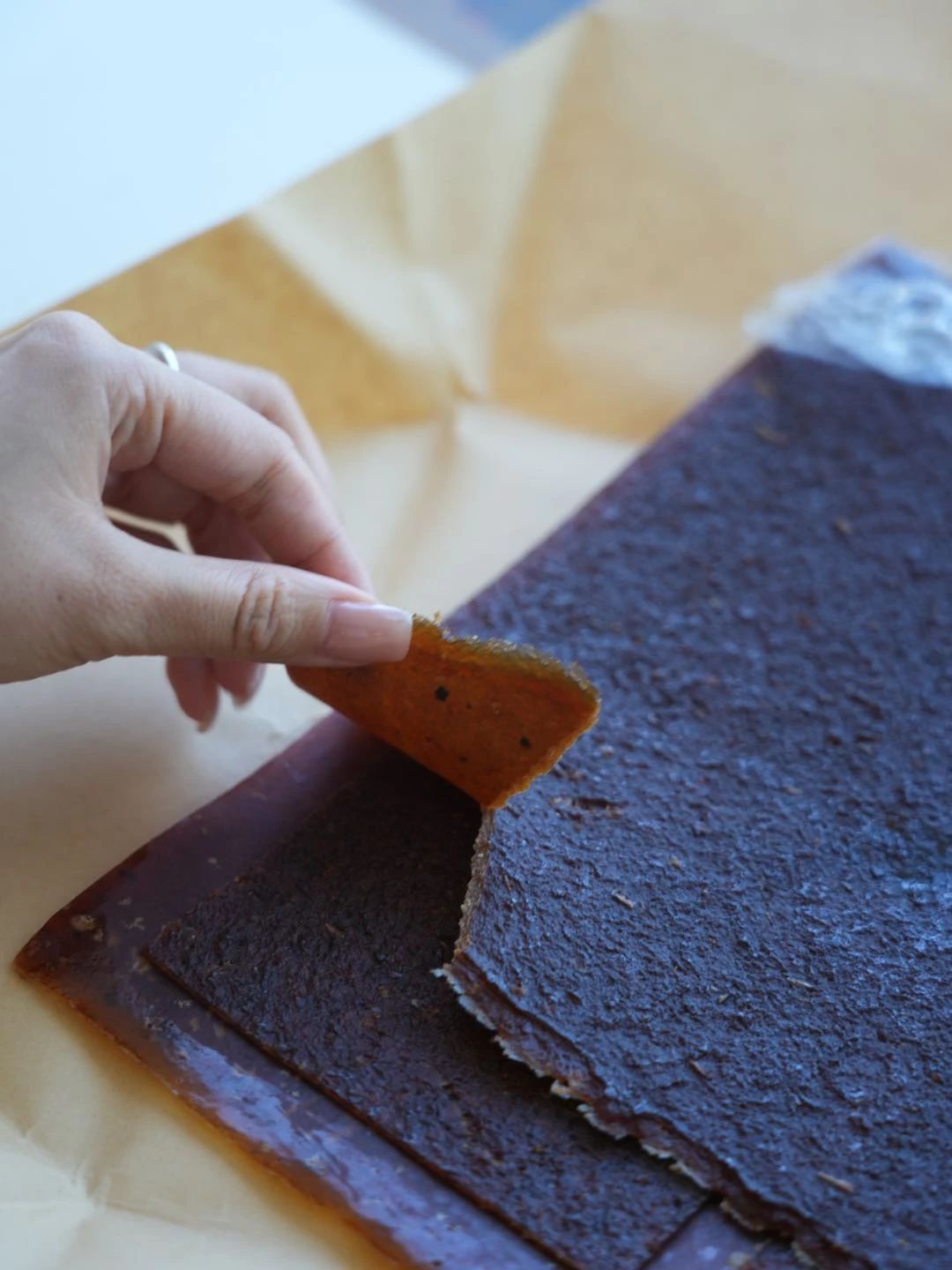 深紅色的果丹皮厚似牛皮紙,咬下去先嘗到杏子的酸,蘋果的清甜隨后漫開。嚼起來有著些許的韌勁,牙齒需用些力氣。