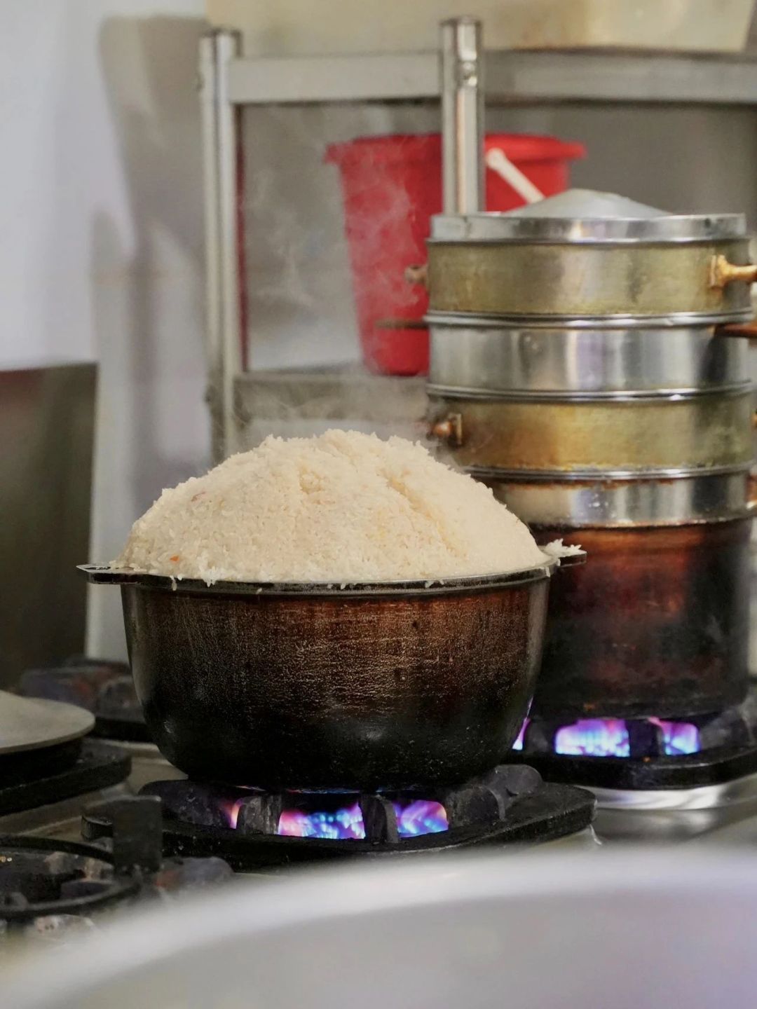 做好食材準(zhǔn)備,傳統(tǒng)匠人便開始熗、炒、煮、燒、燜等制作工序。出鍋前,一定要拿鍋鏟充分攪拌均勻,米粒顆顆挺立如金珠,可以看見鍋底結(jié)出金黃酥脆的鍋巴。