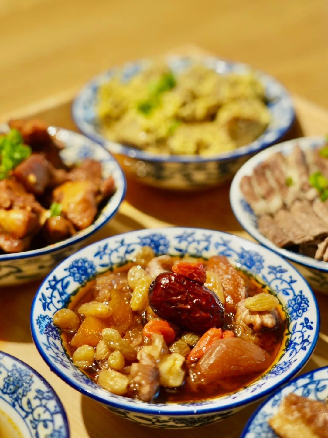 九碗三行字擺法特別,食材也豐富,葷素咸甜暗藏乾坤。我在店內(nèi)邊吃邊和經(jīng)理聊天,他告訴我,這道菜講究從外到里吃,寓意著我們的日子越過越甜蜜。