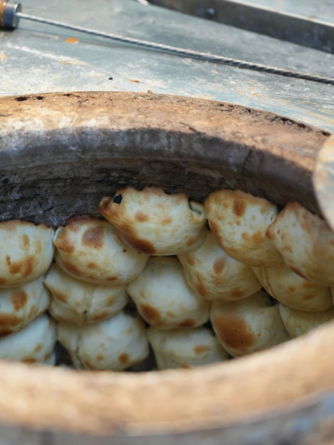 制作時,面團被搟成薄片,包裹著由羊肉、洋蔥、孜然等調(diào)料制成的餡料,然后貼在馕坑壁上。我耐心地站在馕坑邊等待,看白生生的面逐漸褪出焦糖色,十分鐘后烤包子閃著金光出爐。