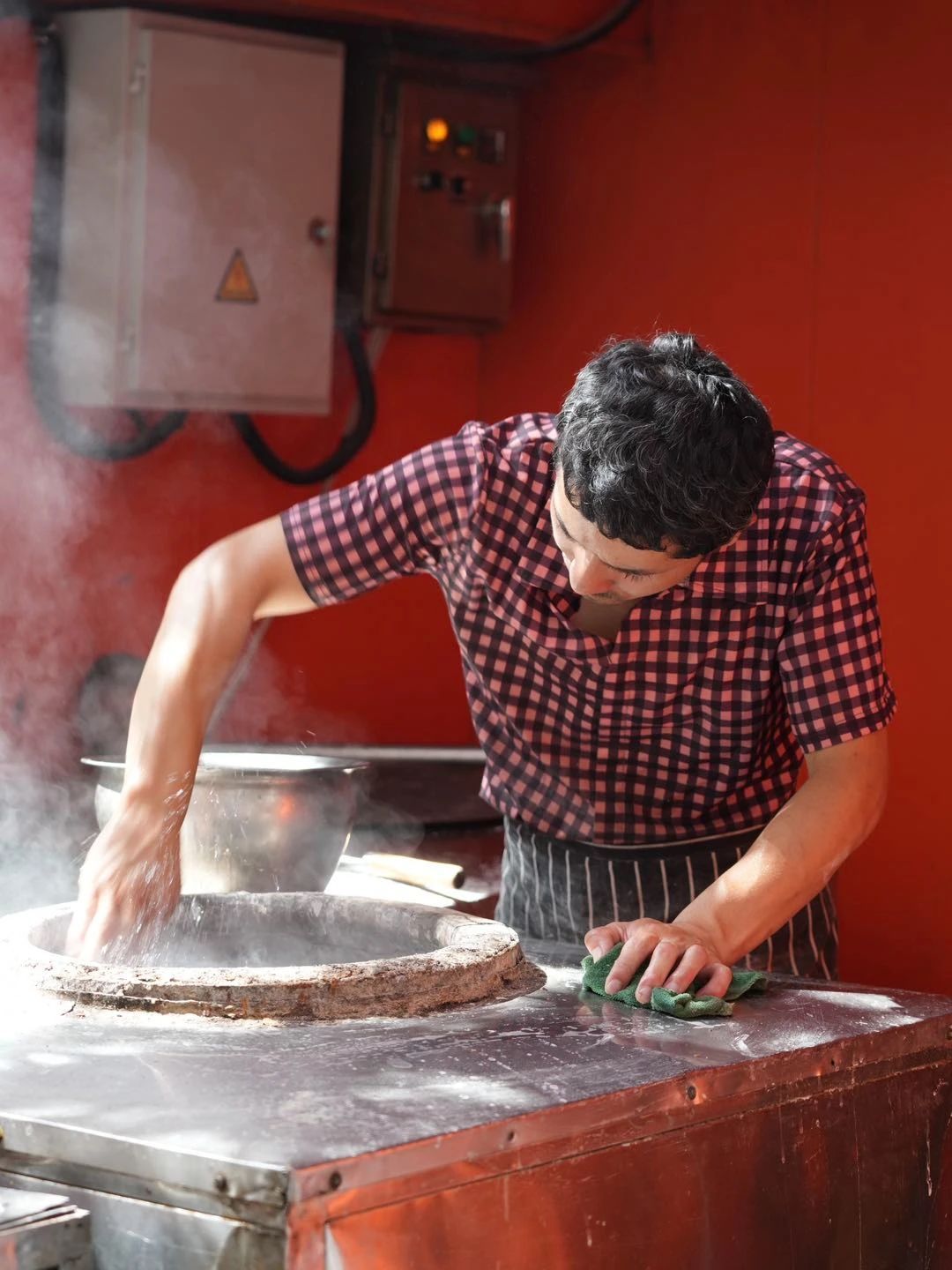 資料甚多,不如去街巷眼見為實。見到許多打馕師傅都有著同款姿勢,用手往馕坑里灑水,“滋啦”一聲白煙竄起。聽師傅說,貼面前灑些鹽水給過熱的馕坑壁降溫,防止把馕打糊。