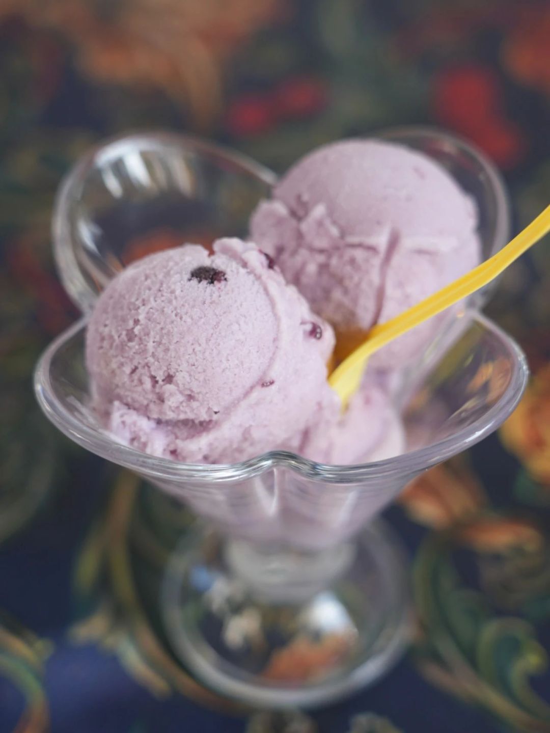 玻璃杯里是三個圓滾滾的球。選擇了藍莓口味,依舊是記憶中的味道,奶味十足,藍莓香氣點綴,不過分的甜,也可以混搭嘗到不同的口味。