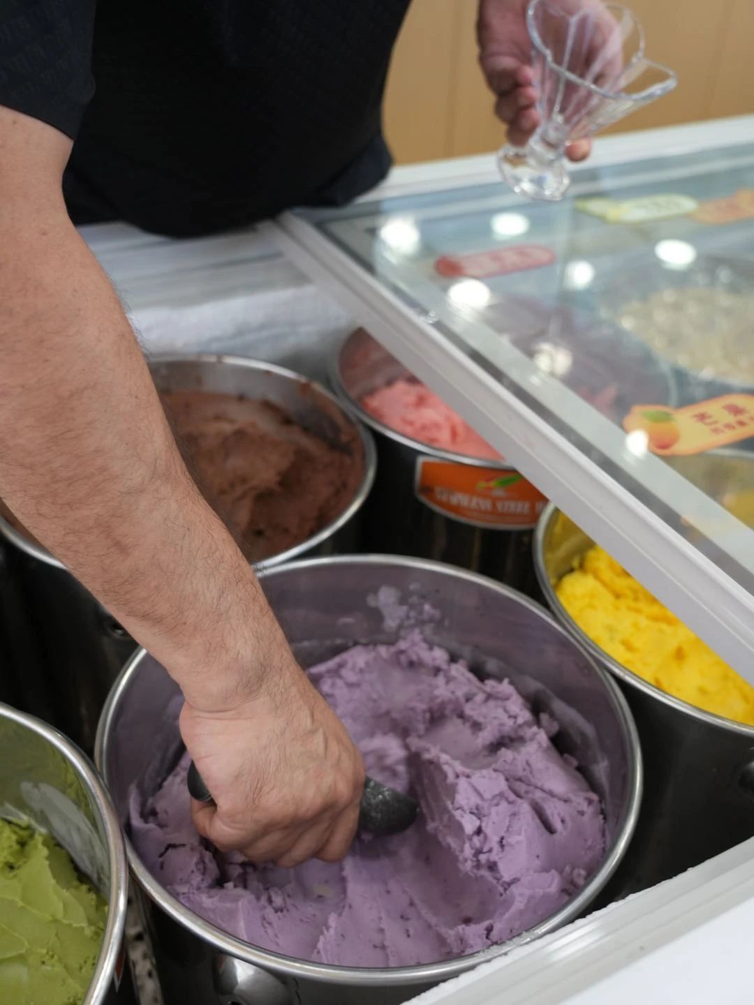 這種古法手工冰淇淋只用牛奶、白砂糖、雞蛋、天然水果為基礎(chǔ),不加一滴水,依靠手工反復(fù)攪拌凝乳形成綿密口感。