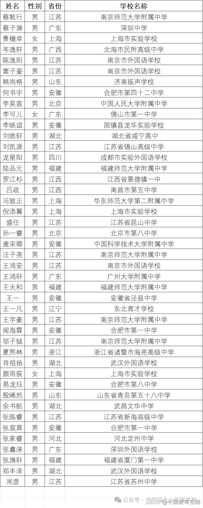 從生源學校來看,南京師范大學附屬中學人數(shù)最多,有4人入圍;其次是南京外國語學校、上海實驗學校,分別有3人入圍。