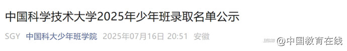 7月16日,中國科學技術大學少年班學院官微發(fā)布《中國科學技術大學2025年少年班錄取名單公示》,共有44名學子入圍。