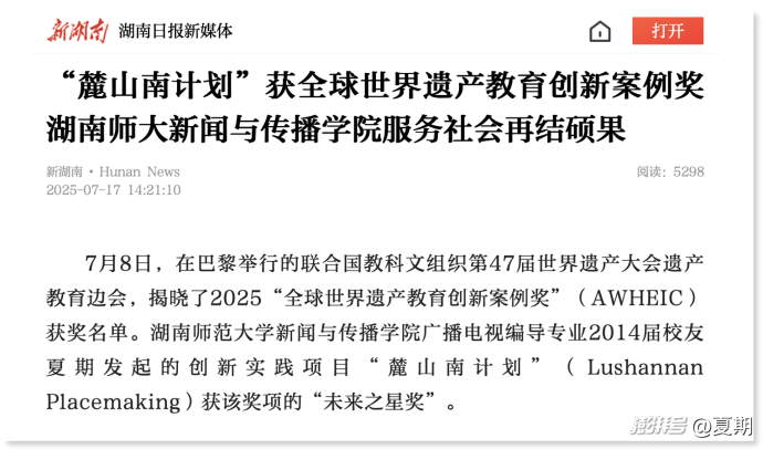 “麓山南計(jì)劃”榮獲2025全球世界遺產(chǎn)教育創(chuàng)新案例獎(jiǎng)