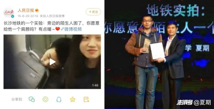 2015年夏天,項目團隊聯(lián)合多家媒體策劃并發(fā)布了公益短片《長沙地鐵實拍:你愿意借陌生人肩膀么》,該片記錄長沙地鐵乘客相互依靠、借肩而眠的場景,短片上線后播放量超過1億次,被近10家衛(wèi)視報道及人民日報官方賬號推薦。