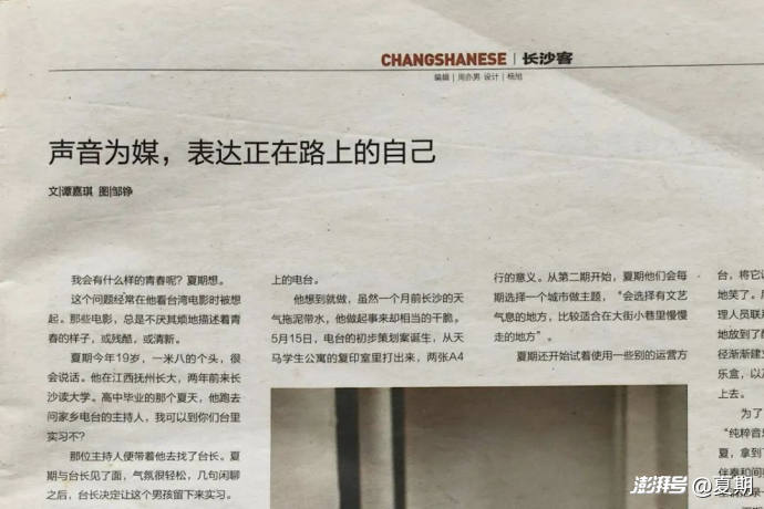 此后,地方媒體開始關(guān)注項目,瀟湘晨報以《大學(xué)生辦網(wǎng)絡(luò)電臺走的是文藝范》為題進行了通訊報道,晨報周刊也以整版專題《聲音為媒,表達正在路上的自己》介紹了項目發(fā)起人及其經(jīng)歷。