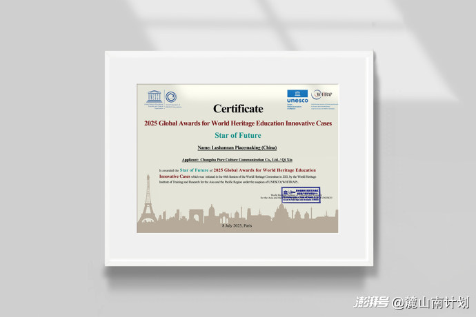 2025年7月8日,在巴黎聯(lián)合國教科文組織總部舉行的第47屆世界遺產(chǎn)大會遺產(chǎn)教育邊會上,麓山南計劃(Lushannan Placemaking)榮獲“全球世界遺產(chǎn)教育創(chuàng)新案例獎”(AWHEIC)。主辦方評價:以青年為主題的新銳實踐,蘊含遺產(chǎn)教育模式創(chuàng)新的無限潛力與可能,代表了未來的方向。