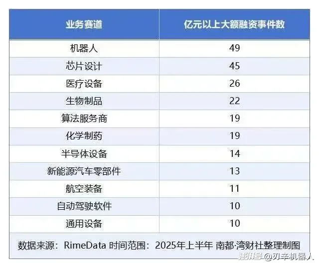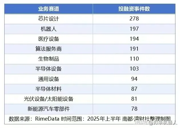 2025年上半年,屬于裝備制造行業(yè)大類的機(jī)器人賽道,共錄得197條投融資事件,僅次于芯片設(shè)計(jì)排名第二。