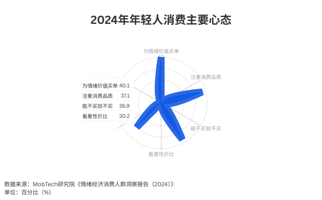 MobTech研究院報告指出:2024年,年輕人為情緒價值與興趣買單的比例達到 40.1%,成為其消費的首要動因。消費者對商品的需求已超越基礎(chǔ)功能層面,轉(zhuǎn)而更加注重商品所承載的情感聯(lián)結(jié)與情緒滿足。
