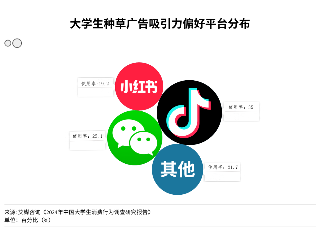 iiMedia Research(艾媒咨詢)報告數(shù)據(jù)顯示,35%的大學(xué)生表示最能夠被抖音等短視頻平臺的廣告所吸引;緊隨其后的是微信(25.1%)和小紅書(19.2%)。