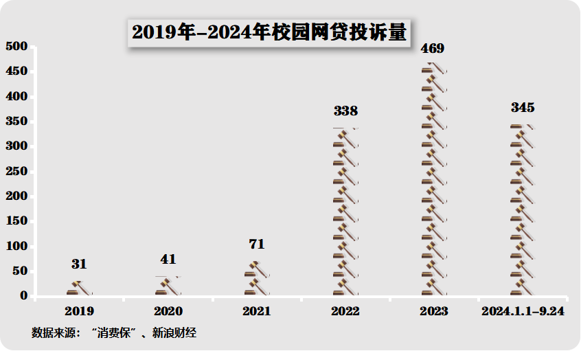 超前消費在拉動經(jīng)濟增長方面展現(xiàn)出巨大潛力,也同樣面臨社會和消費市場帶來的挑戰(zhàn)。由新浪財經(jīng)統(tǒng)計、消費保平臺共同整合數(shù)據(jù)顯示,截至 2024 年 9 月 24 日,平臺累計收到網(wǎng)貸行業(yè)相關(guān)投訴 142798 件,其中校園貸相關(guān)投訴 1295 件,解決率為 58.38%,且涉訴金額呈逐年上升趨勢。值得關(guān)注的是,2023 年全年校園貸投訴量達 469 件,同比增長 38.76%;2024年近一年的時間里,校園貸相關(guān)投訴已達 345 件。
