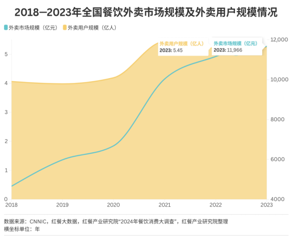 除此之外,在校園生活中,即時配送服務(wù)正悄然改變著大學(xué)生的消費習(xí)慣。類似“30分鐘準時達”“全城速送”等便捷高效類服務(wù)已迅速崛起,廣泛覆蓋了高校周邊區(qū)域。據(jù)紅餐大數(shù)據(jù)顯示,2023年中國餐飲外賣市場規(guī)模約為1.2萬億元,占全國餐飲收入的五分之一。在2018-2023年這四年間,其年復(fù)合增長率超過20%,成為了餐飲市場重要的增長引擎。即時配送在線上消費的基礎(chǔ)上進一步為大學(xué)生帶去便利與時效,不斷改善與升級,刺激外賣消費,驅(qū)動校園外賣實現(xiàn)大規(guī)模的擴張。