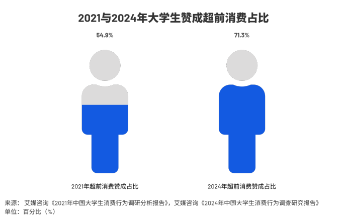 小濛的經(jīng)歷并非個例。根據(jù)艾媒咨詢《2021年中國大學(xué)生消費行為調(diào)研分析報告》數(shù)據(jù)顯示,有54.9%的大學(xué)生贊成超前消費,且其中11.9%的大學(xué)生有超前消費習(xí)慣。在有超前消費行為的大學(xué)生中,近四成超前消費金額在500-1000元。同比2024年數(shù)據(jù),超七成的大學(xué)生贊成超前消費??梢?,持贊成態(tài)度的比例不斷增加。艾媒咨詢分析師認為,超前消費行為逐漸涌入大學(xué)生的視野,并變得日益普遍和流行。