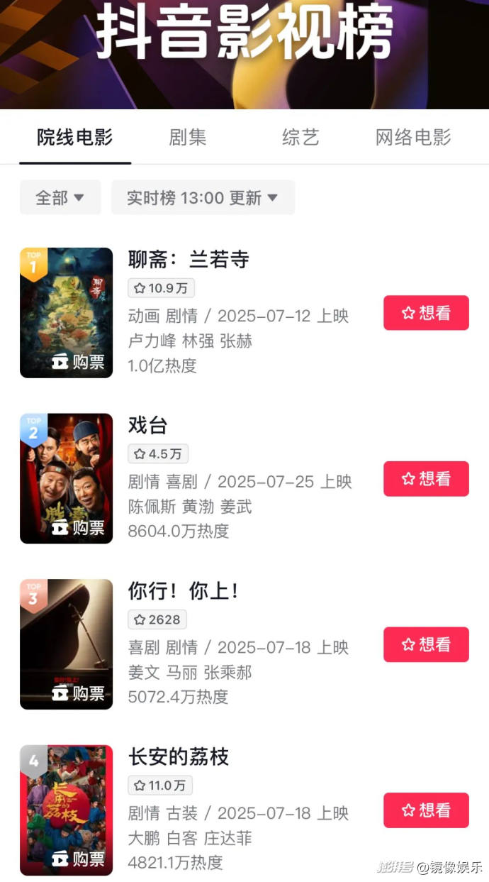 從抖音電影榜7月20日的數(shù)據(jù)來(lái)看,《長(zhǎng)安的荔枝》的實(shí)時(shí)熱度位居榜單第一,排在上映首周的《聊齋:蘭若寺》和待映的《戲臺(tái)》《你行!你上!》之前。