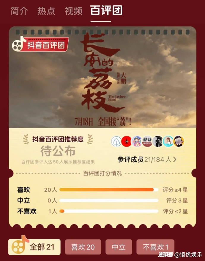 當(dāng)抖音電影評(píng)分成為觀(guān)影群體決策的又一大風(fēng)向標(biāo)后,外界也可以通過(guò)抖音評(píng)分對(duì)《長(zhǎng)安的荔枝》質(zhì)量有更多維的理解,如今,《長(zhǎng)安的荔枝》抖音評(píng)分為7.7分。此外,抖音匯集百余名影評(píng)人的百評(píng)團(tuán)中,已有41人對(duì)《長(zhǎng)安的荔枝》進(jìn)行打分,其中“喜歡”也就是認(rèn)為影片評(píng)分在四星及以上的為39人。