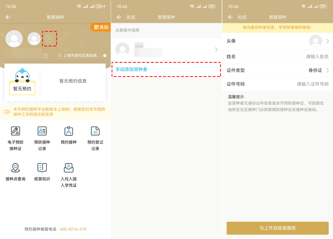點(diǎn)擊頁面右上方的“⊕”→點(diǎn)擊“手動添加受種者”→填寫受種者個人信息,完成綁定受種人;