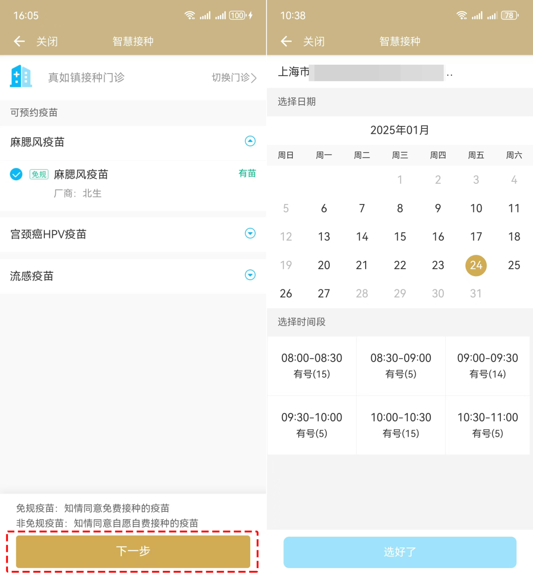 選擇受種者需要預(yù)約的疫苗、接種點(diǎn)信息后,點(diǎn)擊“下一步”→選擇受種日期和時間;