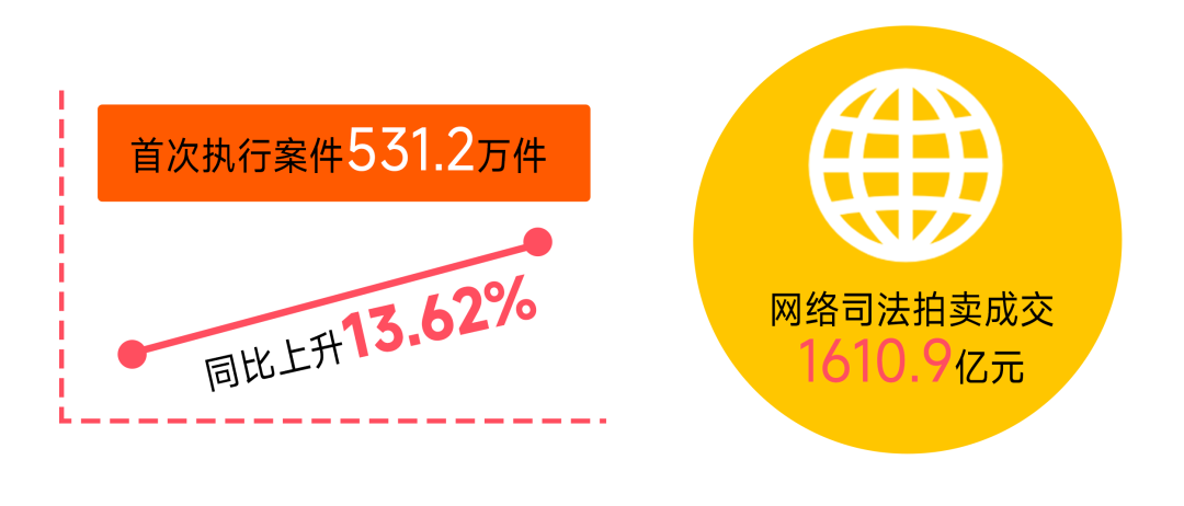 執(zhí)行案件辦理情況。人民法院不斷深化執(zhí)行機制改革,促推“切實解決執(zhí)行難”,積極推動將勝訴當事人“紙上權(quán)益”兌現(xiàn)為“真金白銀”,積極服務法治社會、誠信社會建設。受理首次執(zhí)行案件531.2萬件,同比上升13.62%。執(zhí)行完畢率和執(zhí)行到位率分別為41.96%和54.38%,保持高位運行。新納入失信名單103.3萬人次,同比下降2.46%,連續(xù)五個季度下降;111.58萬人次通過信用修復回歸市場,信用修復工作的科學管理水平穩(wěn)步提升。網(wǎng)絡司法拍賣成交1610.9億元,上拍量、成交量、成交率同比上升,財產(chǎn)處置工作成效持續(xù)提升。