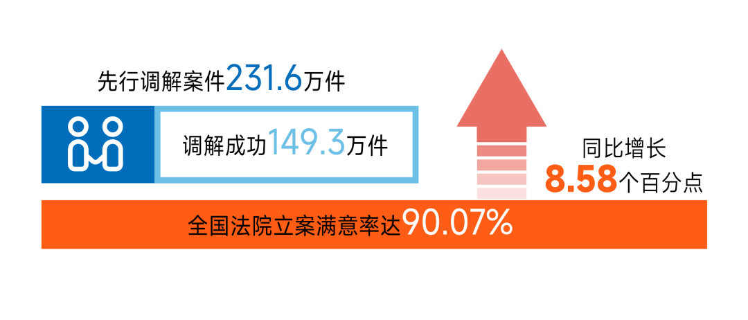 立案和先行調(diào)解情況。人民法院堅持把非訴訟糾紛解決機制挺在前面,全力參與社會治安綜合治理中心規(guī)范化建設,有機銜接登記立案、委托調(diào)解、依法審理,持續(xù)深化完善訴調(diào)對接工作機制,有效發(fā)揮多元解紛機制作用。先行調(diào)解案件231.6萬件,調(diào)解成功149.3萬件,先行調(diào)解成功數(shù)量逐月明顯增長,第二季度先行調(diào)解成功107.2萬件,環(huán)比增長176.1%,前端解紛活力和效能持續(xù)釋放。截至6月底,2883家基層法院派出訴訟服務團隊入駐綜治中心,促推糾紛化解從“多頭跑”向“一站解”轉(zhuǎn)變。指導“總對總”合作單位調(diào)解糾紛40萬件,其中依托人民法院調(diào)解平臺,“總對總”合作單位自行調(diào)解27.2萬件,同比增長10.3倍,“總對總”多元解紛機制持續(xù)深化。起訴狀、答辯狀示范文本應用貫穿糾紛化解全流程,更有利于當事人準確、全面表達訴求,促推調(diào)解和案件審理質(zhì)效進一步提升,72%的當事人、律師主動應用要素式示范文本開展訴訟,較第一季度增長21個百分點,金融借款合同、信用卡、保證保險合同等糾紛起訴狀示范文本應用率超80%,當事人應用體驗感持續(xù)提升,全國法院立案滿意率達90.07%,同比增長8.58個百分點。