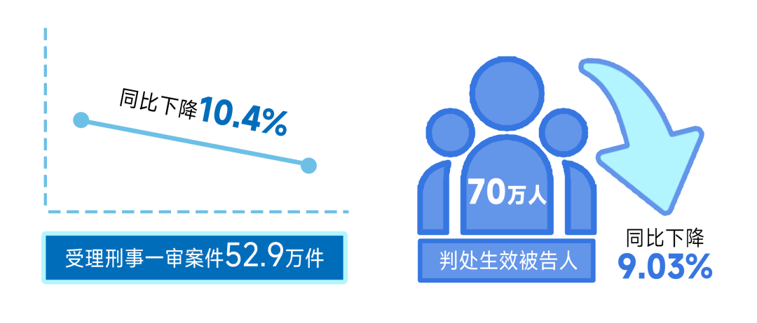 刑事案件審判情況。人民法院全面貫徹總體國家安全觀,準確貫徹寬嚴相濟刑事政策,依法懲治各類犯罪,以嚴格公正司法維護國家安全和社會穩(wěn)定。受理刑事一審案件52.9萬件,同比下降10.4%。判處生效被告人70萬人,同比下降9.03%。依法嚴懲嚴重刑事犯罪,判處五年有期徒刑以上刑罰的罪犯5.1萬人,同比下降4.65%。受理破壞社會主義市場經(jīng)濟秩序罪一審案件3.5萬件,同比上升2.65%。最高人民法院發(fā)布5件促進民營經(jīng)濟發(fā)展典型刑事案例,加強對非法經(jīng)營、合同詐騙、強迫交易、民營企業(yè)內(nèi)部腐敗犯罪等案件的監(jiān)督指導,依法平等保護民營企業(yè)合法權(quán)益。受理串通投標罪一審案件707件,同比上升30.44%。針對串通投標犯罪大幅上升態(tài)勢,最高人民法院聯(lián)合國家發(fā)展和改革委員會發(fā)布6件典型案例,涵蓋工程建設、物資采購、土地承包等多個經(jīng)濟領(lǐng)域,發(fā)揮典型案例教育警示震懾作用。受理危險駕駛罪一審案件12.1萬件,同比下降14.96%。危險駕駛刑事案件數(shù)量降幅明顯,但仍居刑事案件第一位。人民法院深入貫徹落實《關(guān)于辦理醉酒危險駕駛刑事案件的意見》,規(guī)范案件辦理,統(tǒng)一裁判尺度,實現(xiàn)對醉駕犯罪的精準打擊、懲防并重。