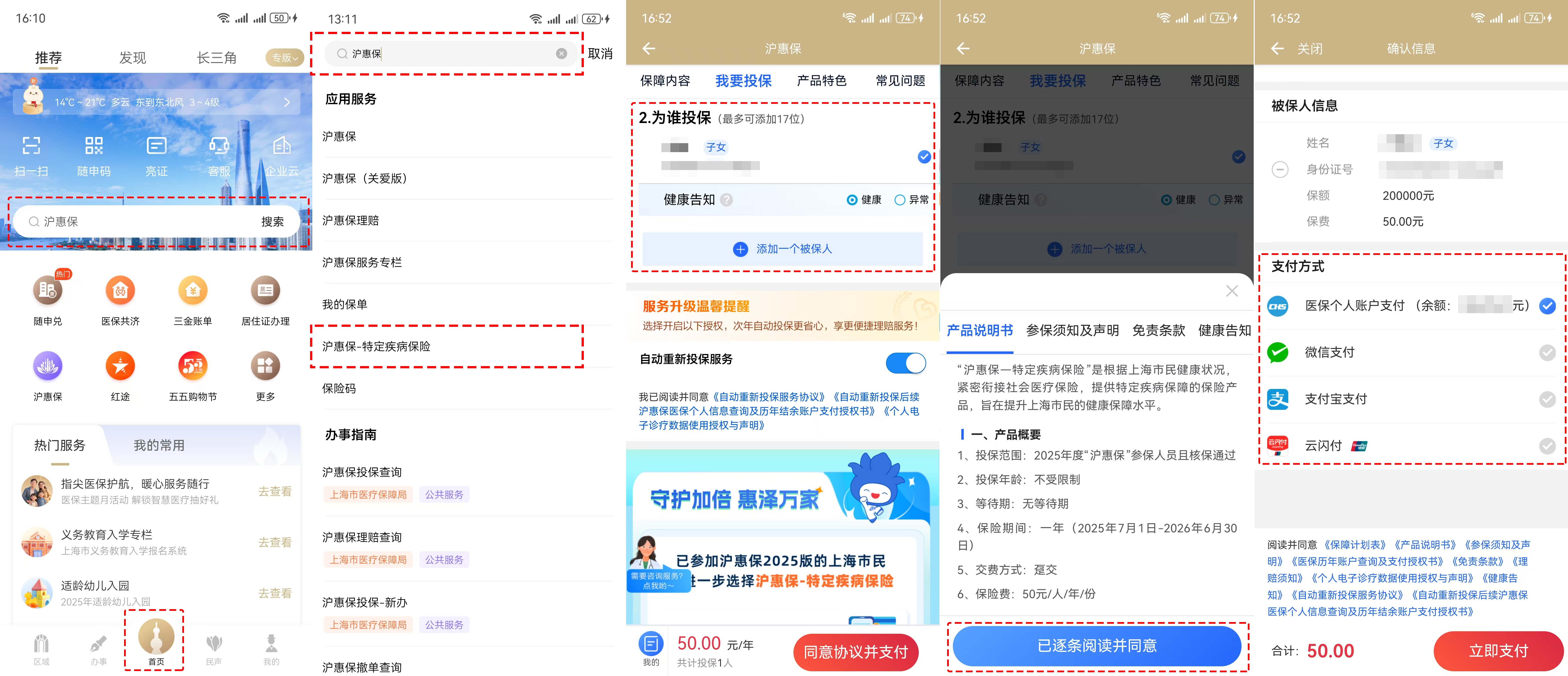 登錄“隨申辦市民云”APP→首頁搜索框中輸入“滬惠?!薄c擊“滬惠保—特定疾病保險”進入投保頁面→選擇參保人,勾選“健康告知”→閱讀投保須知→選擇付款方式→完成付款后,即投保成功。