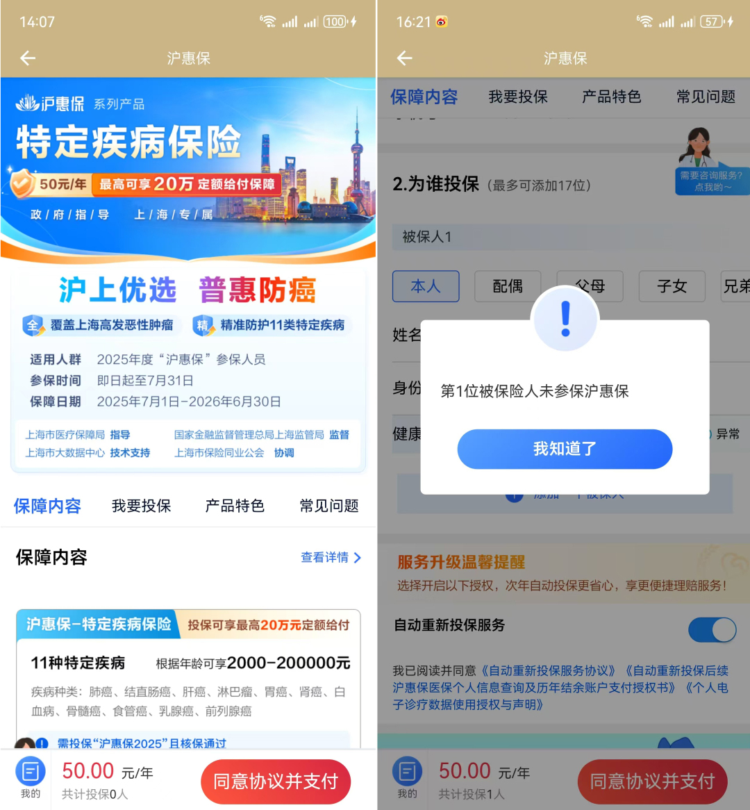 只有已參加2025版“滬惠?!钡膮⒈H耍趴蛇M一步獲得“滬惠保-特定疾病保險”的投保資格。如您尚未參加2025版“滬惠保”,則無法正常投保。