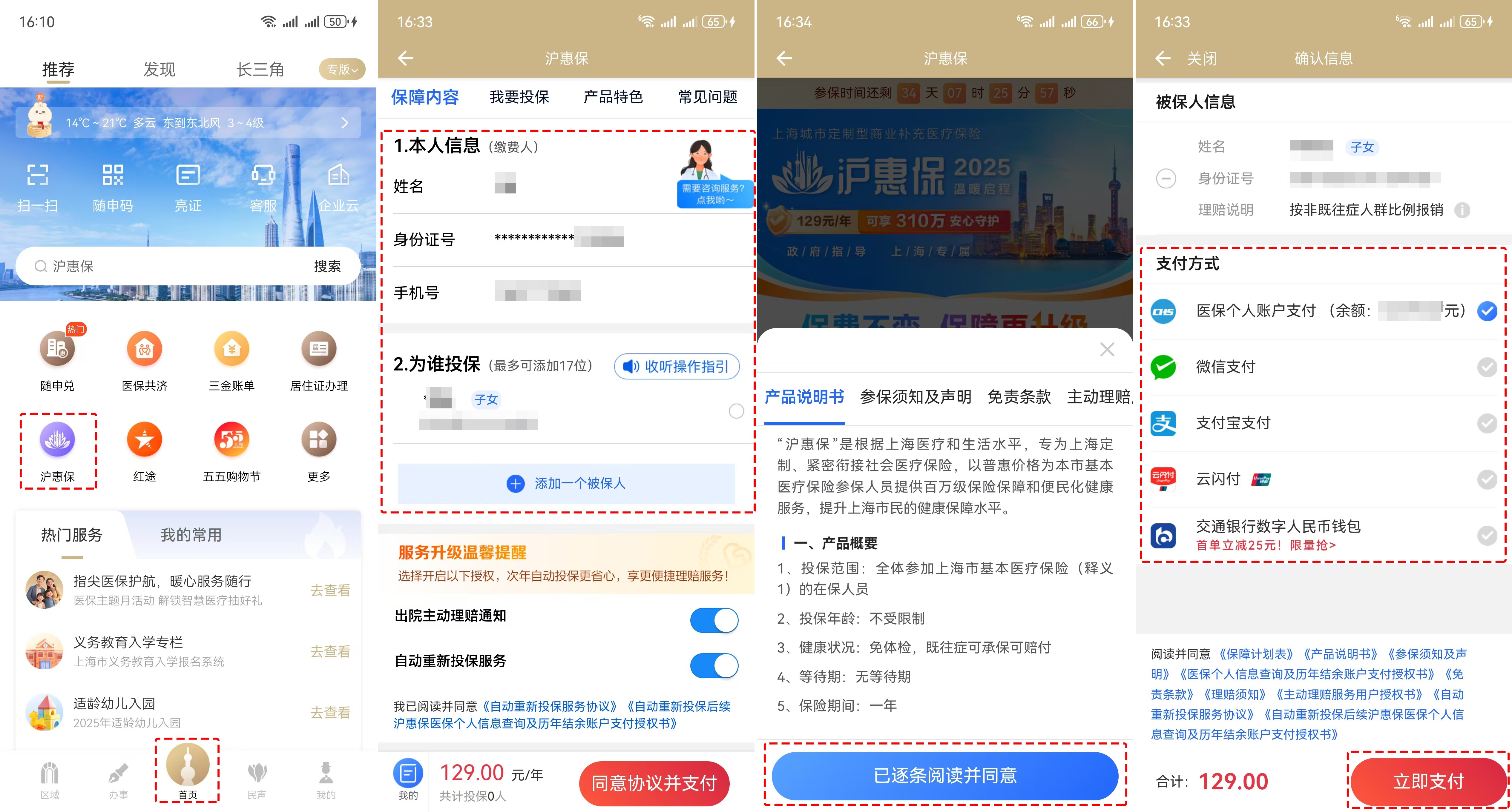 登錄“隨申辦市民云”APP→首頁點擊“滬惠?!薄x擇參保人→閱讀投保須知→選擇付款方式→繳費完成后,即完成投保。