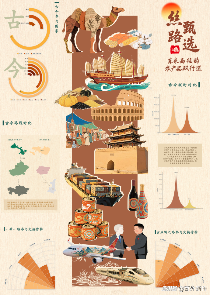 畫面中央的插畫區(qū)以時(shí)間為線索,從古代的駝隊(duì)、帆船,到現(xiàn)代的巨輪、飛機(jī)與高鐵,生動描繪了貿(mào)易載體歷經(jīng)千年的演變歷程。 古代絲路貿(mào)易涉及的國家數(shù)量相對有限,主要集中在亞歐大陸的部分區(qū)域,而現(xiàn)代參與農(nóng)產(chǎn)品貿(mào)易的國家數(shù)量大幅增加,覆蓋范圍擴(kuò)展至全球更多地區(qū);以地理信息為基礎(chǔ),將現(xiàn)代花牛蘋果的貿(mào)易路線與古代胡桃的貿(mào)易路線進(jìn)行疊加展示,發(fā)現(xiàn)二者在關(guān)鍵節(jié)點(diǎn)和走向上高度重合,充分體現(xiàn)了絲路貿(mào)易路線在歷史長河中的延續(xù)性和穩(wěn)定性;古代由于交通和通訊條件的限制,貿(mào)易用時(shí)較長,而現(xiàn)代借助先進(jìn)的交通工具和通訊技術(shù),貿(mào)易用時(shí)大幅縮短,清晰地反映出貿(mào)易效率的巨大提升;古代交換的作物種類相對較少,主要集中在一些具有地域特色的農(nóng)產(chǎn)品,而現(xiàn)代交換的作物種類則極為豐富,涵蓋了全球各地的特色農(nóng)產(chǎn)品,數(shù)量上遠(yuǎn)超古代。 這組多維度的可視化呈現(xiàn),既彰顯了絲路貿(mào)易穿越時(shí)空的深厚傳承,又凸顯了時(shí)代發(fā)展帶來的顯著進(jìn)步,深刻詮釋了絲路精神在當(dāng)代的延續(xù)與升華。