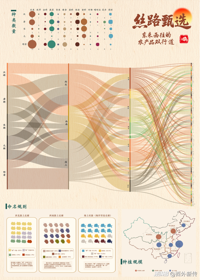 西北的駝鈴、西南的馬幫、南海的帆影,勾勒出古代中國農(nóng)業(yè)物種東傳圖景。這幅圖以三條通道為線索,散布圓點(diǎn)對應(yīng)圖中各朝代、各品類物種分布,揭示不同路徑特色物種,呈現(xiàn)漢時(shí)西北通道水果、染料等品類數(shù)量變化;蜿蜒?;鶊D展現(xiàn)漢、唐、宋、元、明等朝代作物在不同通道的流動規(guī)模變遷,直觀呈現(xiàn)各時(shí)期交流興衰;堆疊命名圖依據(jù)不同通道命名規(guī)則,記錄外來作物名稱漢化印記,如西北“胡”“番” 、西南 “夷” 、海上 “?!?字等前綴;氣泡地圖按種植規(guī)模(小、中、大)呈現(xiàn)舶來作物扎根區(qū)域 。 當(dāng)苜蓿隨陸上駝隊(duì),借西北通道在漢、唐等朝代蔓延,柑橘檸檬乘海船,經(jīng)海上通道漂來,傳播路徑不再抽象。這些視覺呈現(xiàn)聯(lián)動,講述絲路農(nóng)業(yè)交流:借數(shù)據(jù)化的圓點(diǎn)、?;鶊D等,讓波斯葡萄與閩南茶種的時(shí)空交匯有具象支撐,展現(xiàn)差異碰撞、交融新生的過程,證明真正的富饒,源于交流傳遞,而圖中各朝代、各通道的物種數(shù)量、流動規(guī)模等信息,是這場交流最直接的注腳。