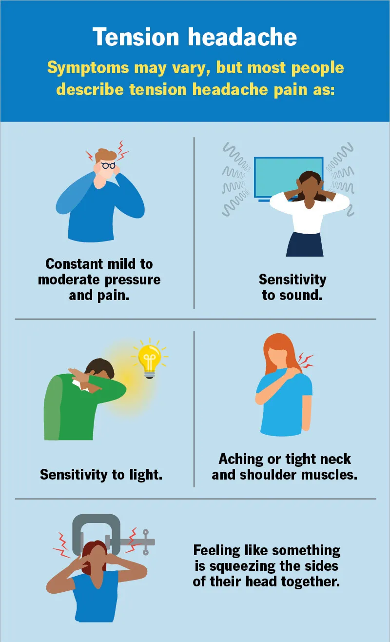 與偏頭痛不同,緊張型頭痛通常不會(huì)在頭痛時(shí)出現(xiàn)惡心或嘔吐的癥狀,也不會(huì)出現(xiàn)頭痛前的先兆癥狀,比如說(shuō)看到亮點(diǎn)或炫光;身體活動(dòng)通常會(huì)加重偏頭痛,但不會(huì)加重緊張型頭痛;緊張型頭痛也可能出現(xiàn)畏光或畏聲,但不如在偏頭痛中常見(jiàn)。