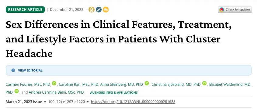 2023年3月21日發(fā)表在《神經(jīng)病學(xué)》雜志上的一項(xiàng)研究發(fā)現(xiàn),女性更容易患慢性叢集型頭痛(叢集性頭痛期間沒(méi)有緩解期),并且與患有叢集型頭痛的男性相比,女性的頭痛時(shí)間更長(zhǎng)、更不安、眼瞼下垂更頻繁。女性更有可能報(bào)告睡眠不足是頭痛的誘因,而男性更有可能報(bào)告飲酒是頭痛的誘因。