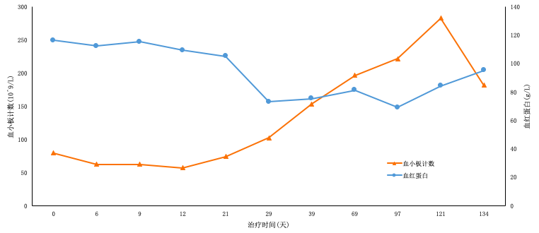 奇跡發(fā)生了!幾個(gè)月后,小凱的血小板升上來(lái)了,肝功能也恢復(fù)正常,但發(fā)現(xiàn)小凱的血紅蛋白逐漸下降,考慮為飲食控制太過(guò)嚴(yán)格,在治療97天時(shí),營(yíng)養(yǎng)師給小凱調(diào)整了飲食結(jié)構(gòu)后,血紅蛋白后面也逐漸恢復(fù)了正常。