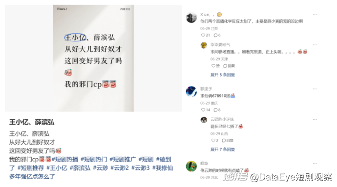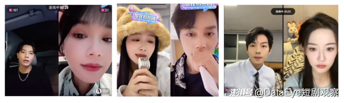 另一方面,不同于影視劇有綜藝、路演,采訪(fǎng)等宣傳渠道,微短劇的宣傳大都停留在線(xiàn)上方面。因此,微短劇演員為了配合宣傳和個(gè)人增粉也會(huì)主動(dòng)下場(chǎng)聯(lián)手營(yíng)業(yè),在微博抖音等平臺(tái)進(jìn)行連麥直播,頻繁互動(dòng)制造糖點(diǎn),讓CP粉可以輕易在小紅書(shū)、抖音等平臺(tái)大量磕糖。