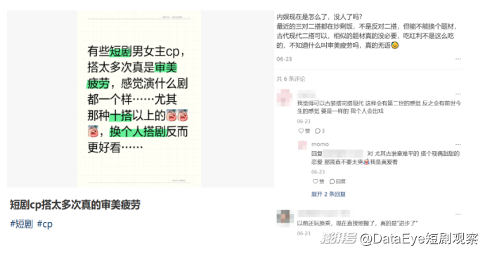 近期,密集上線(xiàn)的女頻微短劇中,不僅有多搭劇同臺(tái)競(jìng)技,還有古裝現(xiàn)代反復(fù)切換,對(duì)于熱衷于磕CP的粉絲來(lái)說(shuō)是大飽眼福,但對(duì)于只關(guān)注劇本身的觀(guān)眾而言,相差不大的劇本題材和反復(fù)多搭的演員組合,在同一檔期內(nèi)密集上線(xiàn),極容易產(chǎn)生審美疲勞。