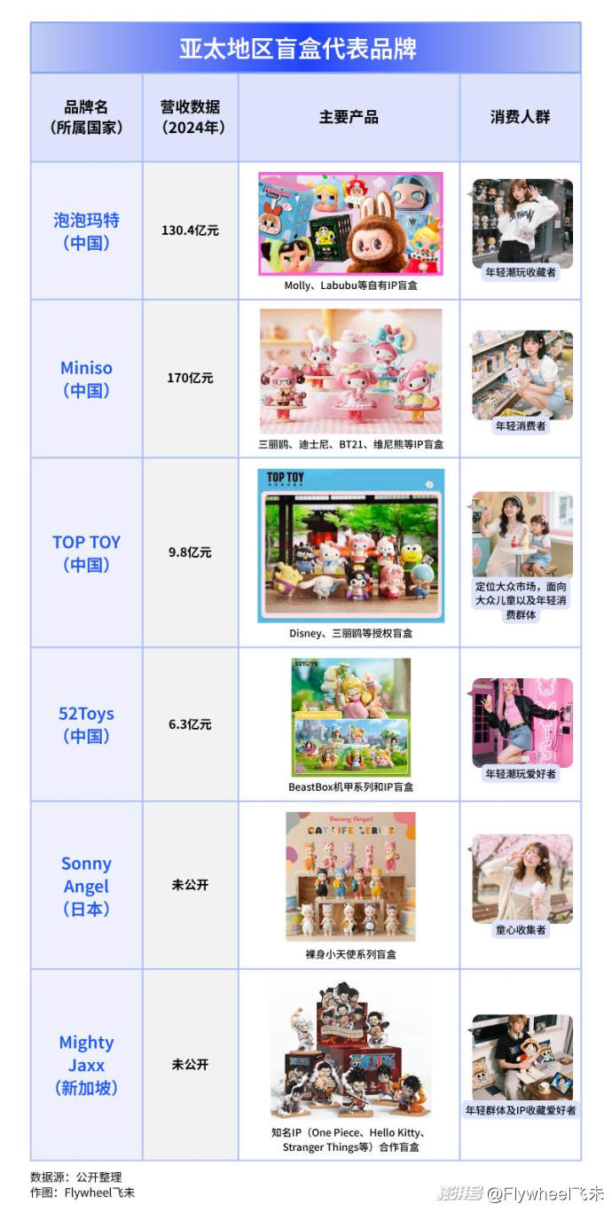 亞太地區(qū)盲盒核心品牌:泡泡瑪特(中國)、Miniso(中國)、TOP TOY(中國)、52Toys(中國)、Sonny Angel(日本)、Mighty Jaxx(新加坡)