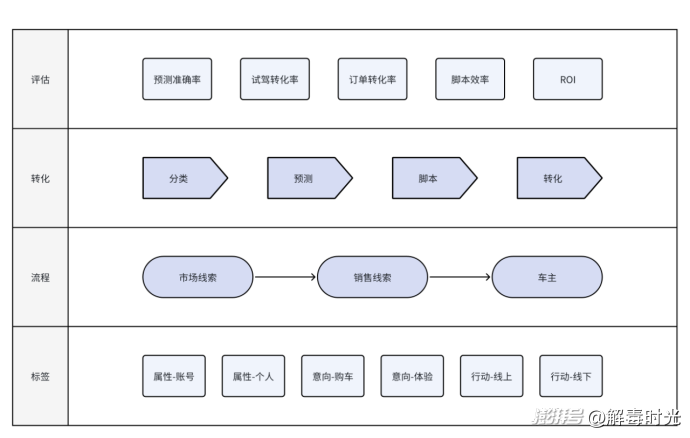 再次強(qiáng)調(diào)的是,線索是信息,同時(shí)也是人。所以給線索打標(biāo)簽實(shí)際上是不斷地完善人的畫像的過程,但人不是靜態(tài)的,需要設(shè)計(jì)一個(gè)流程,促進(jìn)這個(gè)人從“市場(chǎng)線索”轉(zhuǎn)化到“銷售線索”最終轉(zhuǎn)化為“車主”。所以流程和推動(dòng)轉(zhuǎn)化,是在線索標(biāo)簽的基礎(chǔ)上的兩個(gè)關(guān)鍵要素,二者相輔相成。