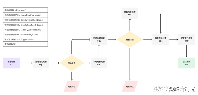 首先是原始線索RL(Raw leads),這就是企業(yè)通過各種方式收集到的潛在客戶的基本數(shù)據(jù)。在這些基本數(shù)據(jù)里面,會(huì)有很多重復(fù)、混亂的信息,一般來說,要經(jīng)過一個(gè)自動(dòng)化的清洗過程,讓其變成真正可用的線索,即自動(dòng)清洗線索AQL(Auto Qualified Leads)。