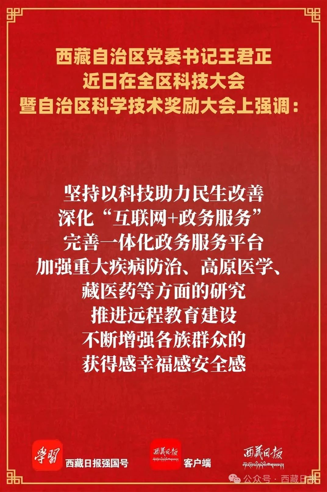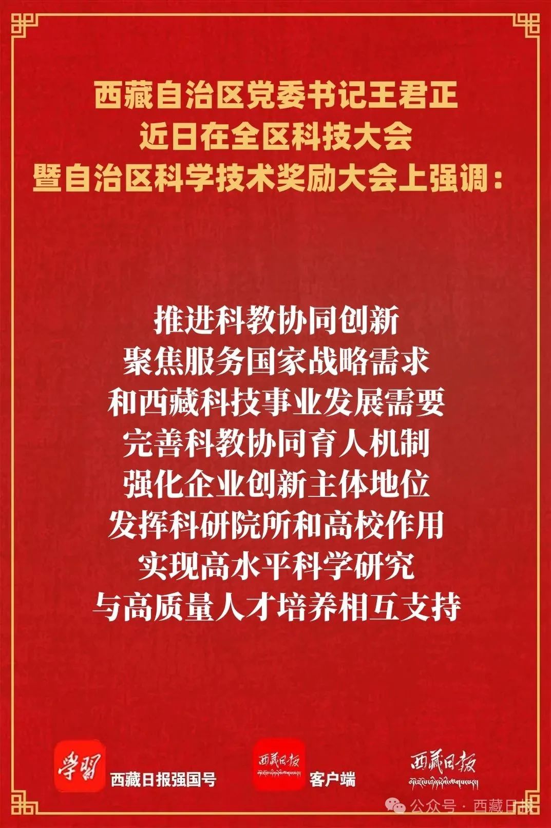 近日,全區(qū)科技大會(huì)暨自治區(qū)科學(xué)技術(shù)獎(jiǎng)勵(lì)大會(huì)在拉薩召開,自治區(qū)黨委書記王君正出席并講話。他強(qiáng)調(diào),要深入貫徹落實(shí)習(xí)近平總書記關(guān)于科技創(chuàng)新、西藏工作的重要指示和新時(shí)代黨的治藏方略,加快推動(dòng)科技事業(yè)發(fā)展,為社會(huì)主義現(xiàn)代化新西藏建設(shè)提供堅(jiān)實(shí)科技支撐。