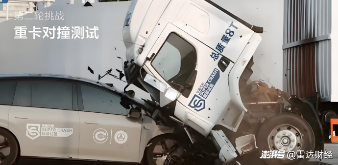 演示視頻顯示,理想i8與一輛重達(dá)8噸的乘龍卡車(chē),以50千米/時(shí)、相對(duì)時(shí)速100千米/時(shí)碰撞,隨后另一輛卡車(chē)從側(cè)面撞擊同一輛i8。