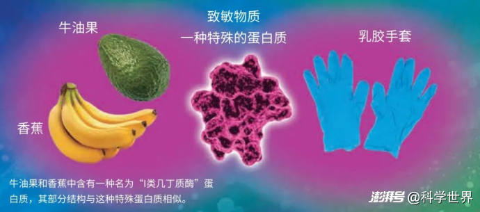 除了花粉和水果,生活中還有其他交叉反應(yīng)的例子。天然橡膠中的一種乳膠成分可能通過受損皮膚進(jìn)入體內(nèi),并被免疫系統(tǒng)認(rèn)定為過敏原。乳膠含有一種特殊的蛋白質(zhì),這種蛋白質(zhì)的結(jié)構(gòu)與牛油果和香蕉等食物中的Ⅰ類幾丁質(zhì)酶的蛋白質(zhì)結(jié)構(gòu)極為相似。
