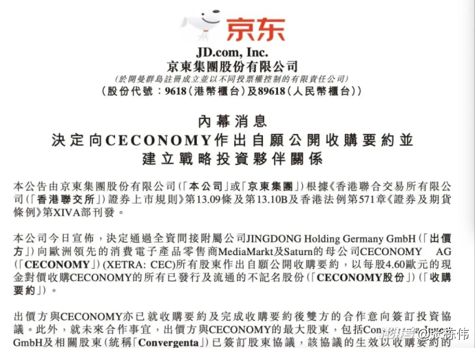 8月3日,京東宣布將收購德國零售商Ceconomy,交易估值達180億元。