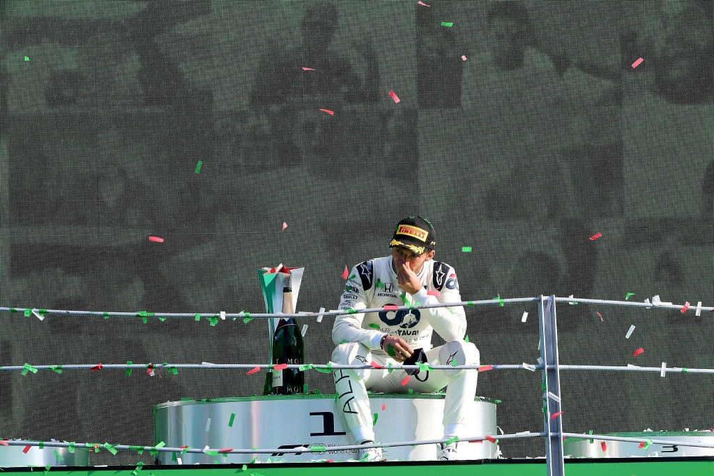 2020年加斯利在意大利蒙扎奪冠時(shí),攝像機(jī)記錄下最多的瞬間并不是他站在領(lǐng)獎(jiǎng)臺(tái)上高舉起獎(jiǎng)杯的那一刻,也不是他朝臺(tái)下的車隊(duì)噴灑香檳的那一刻,而是在彩帶飄落一地的領(lǐng)獎(jiǎng)臺(tái)上,他獨(dú)自坐在獎(jiǎng)杯旁,低埋著頭的樣子。
