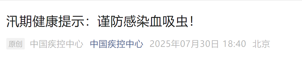中國疾控中心發(fā)布緊急提醒,汛期在洪澇區(qū)域及水溝、沼澤和蘆葦灘等地活動(dòng),應(yīng)謹(jǐn)防血吸蟲感染。