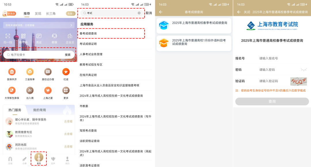 登錄“隨申辦市民云”APP→首頁搜索框中輸入關(guān)鍵字“考試”→點(diǎn)擊“春季成績(jī)查詢”進(jìn)入服務(wù)頁面→點(diǎn)擊選擇你需要查詢的考試進(jìn)入成績(jī)查詢頁面。根據(jù)頁面要求,填寫考生報(bào)名號(hào)、密碼(初始密碼由考生身份證號(hào)碼中的第4至6位和第10至12位的6位數(shù)字組成)