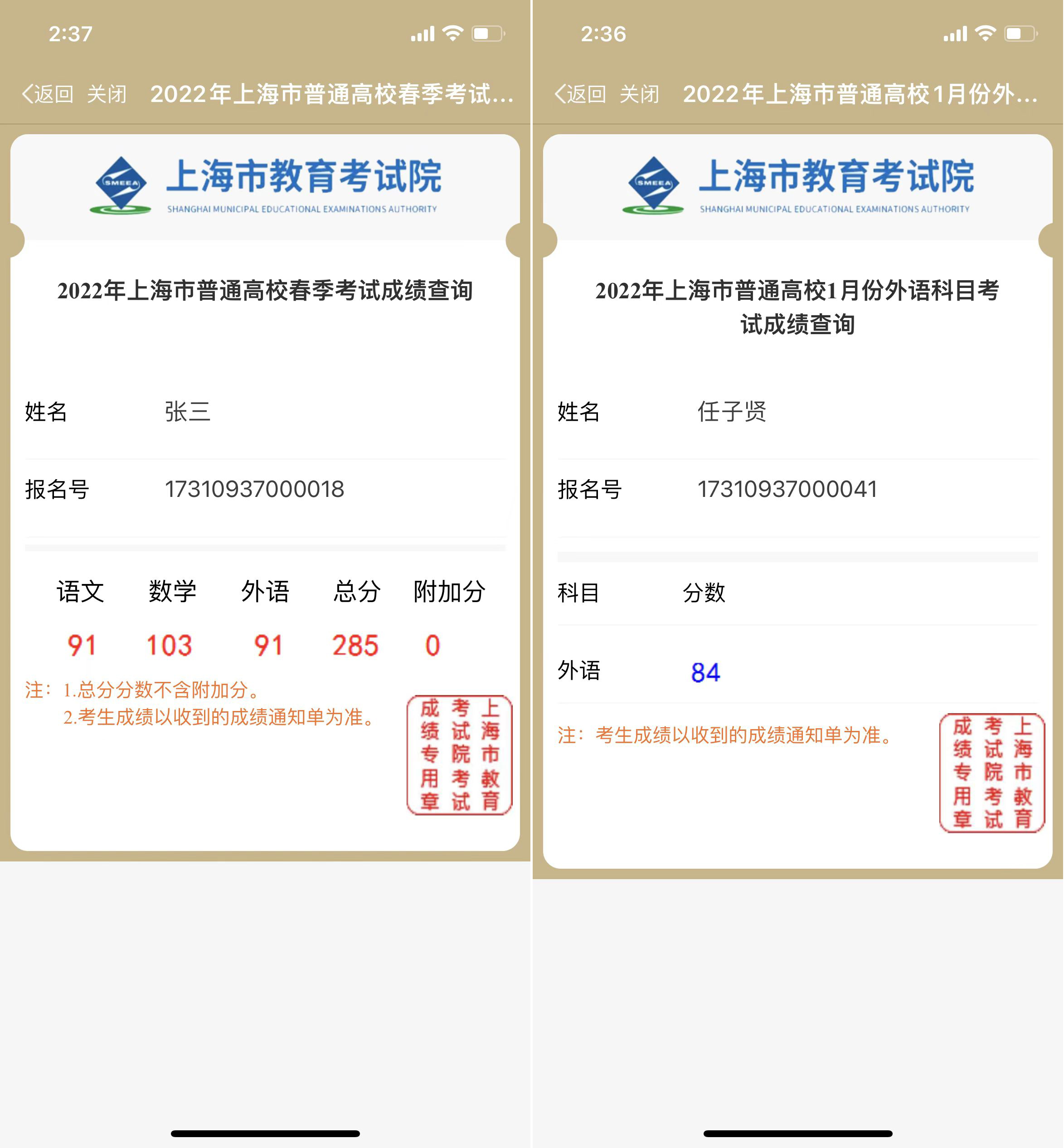 “隨申辦市民云”APP支持在線申請(qǐng)開具:三校生高考、成人高考、秋季高考、中考、表演類專業(yè)統(tǒng)考、書法類專業(yè)統(tǒng)考等多種考試的成績(jī)證明。