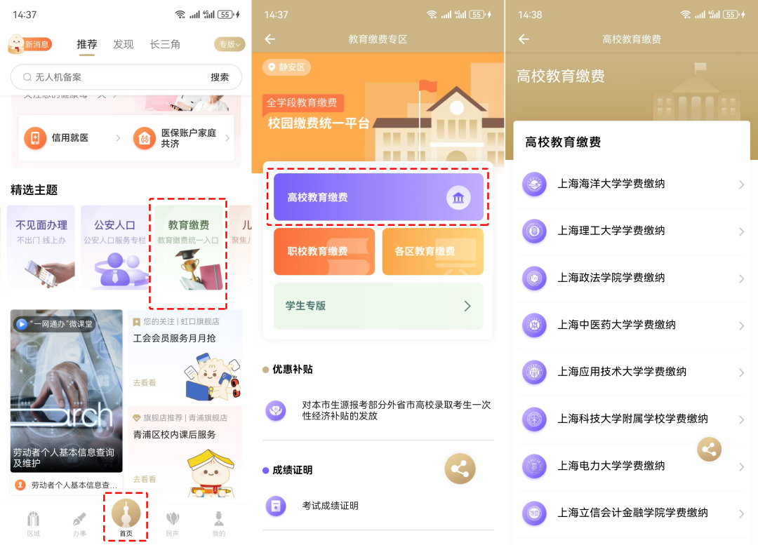 登錄“隨申辦市民云”APP→點(diǎn)擊首頁“精選主題”下的“教育繳費(fèi)”→點(diǎn)擊“高校教育繳費(fèi)”→點(diǎn)擊學(xué)校進(jìn)入繳費(fèi)頁面;