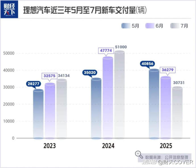 2025年6月和7月,理想汽車的交付量分別為36279輛和30731輛。盡管這一數(shù)字放在市場上依然有很強的競爭力,但和自身過往數(shù)據(jù)相比,隱患初現(xiàn)。